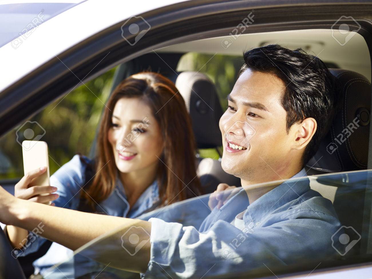 若いアジアのカップルを楽しんでは 女性 Selfie を取って 車に乗る の写真素材 画像素材 Image